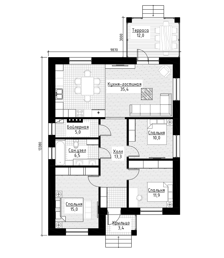 Терраса — 12 м²: место для летних завтраков и вечерних посиделок на свежем воздухе.