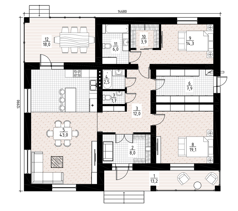 Этот одноэтажный проект создан для удобства и уюта: просторная кухня-гостиная объединяет семью, а приватные спальни и функциональные помещения делают жизнь комфортной и организованной.