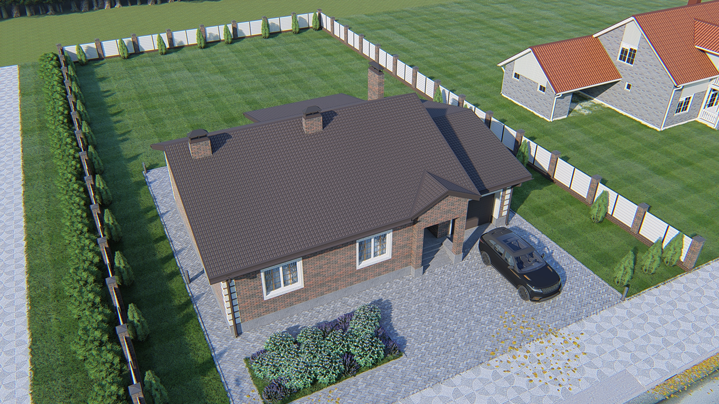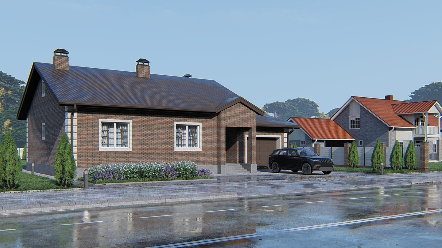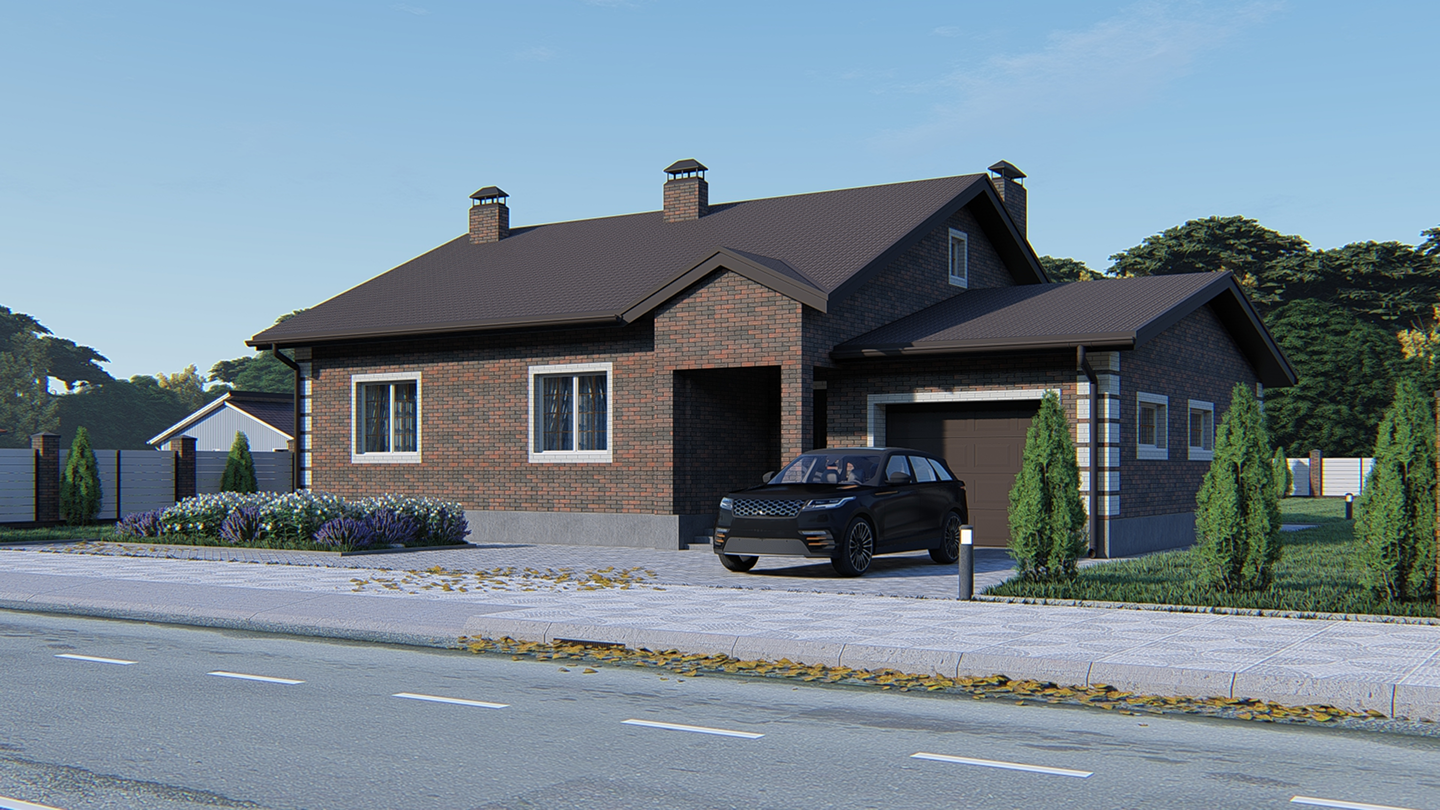 Просторный одноэтажный дом с тремя спальнями, большой кухней-гостиной и гаражом на автомобиль — это удобное решение для семьи, которая ценит комфорт, функциональность и уют.