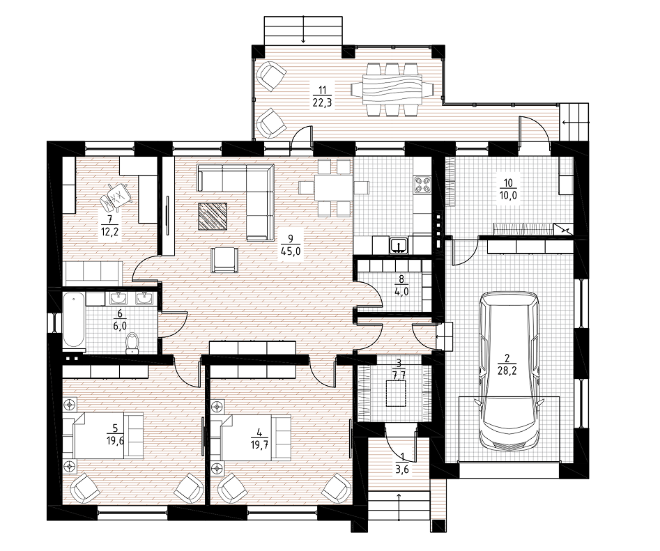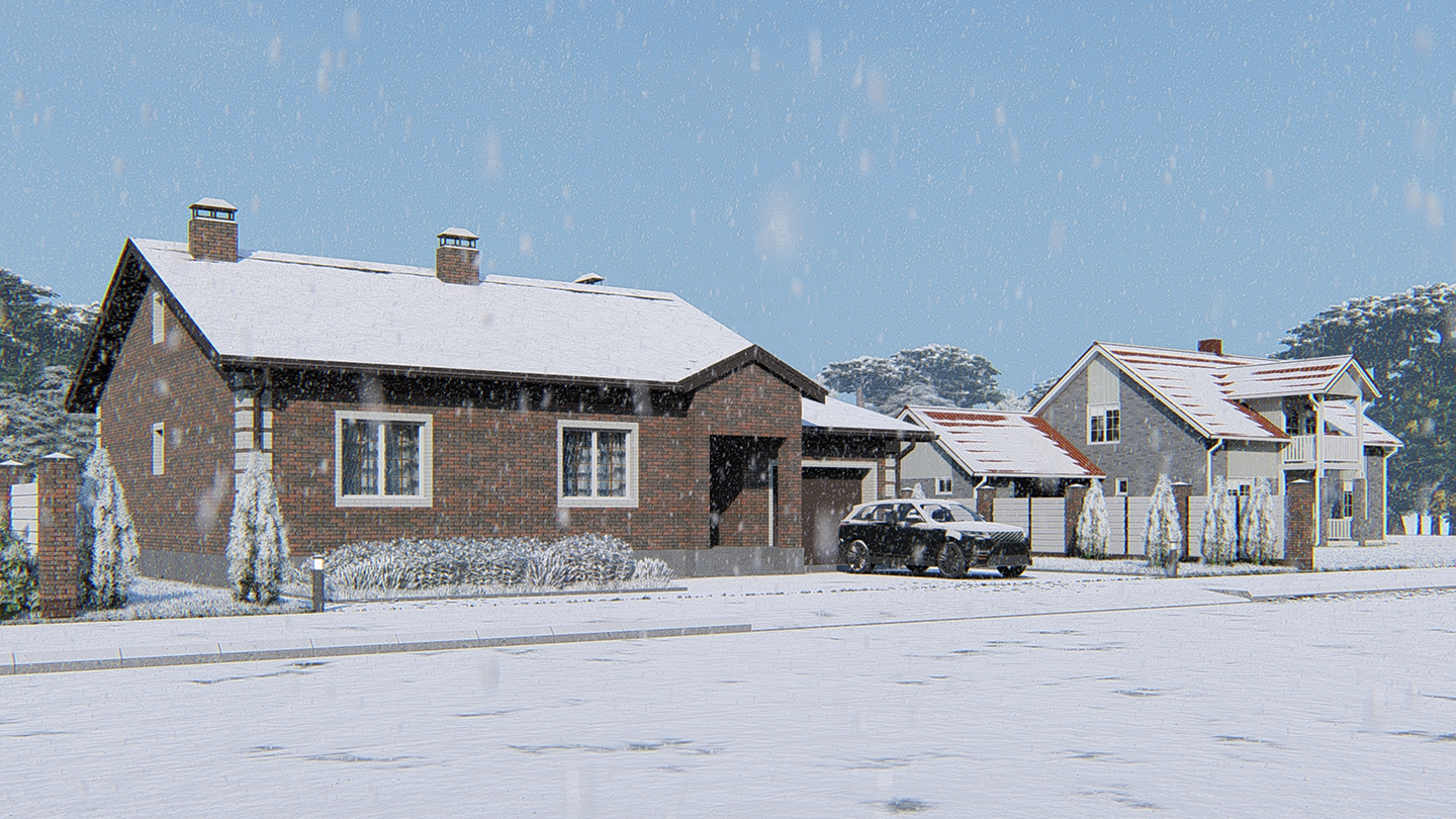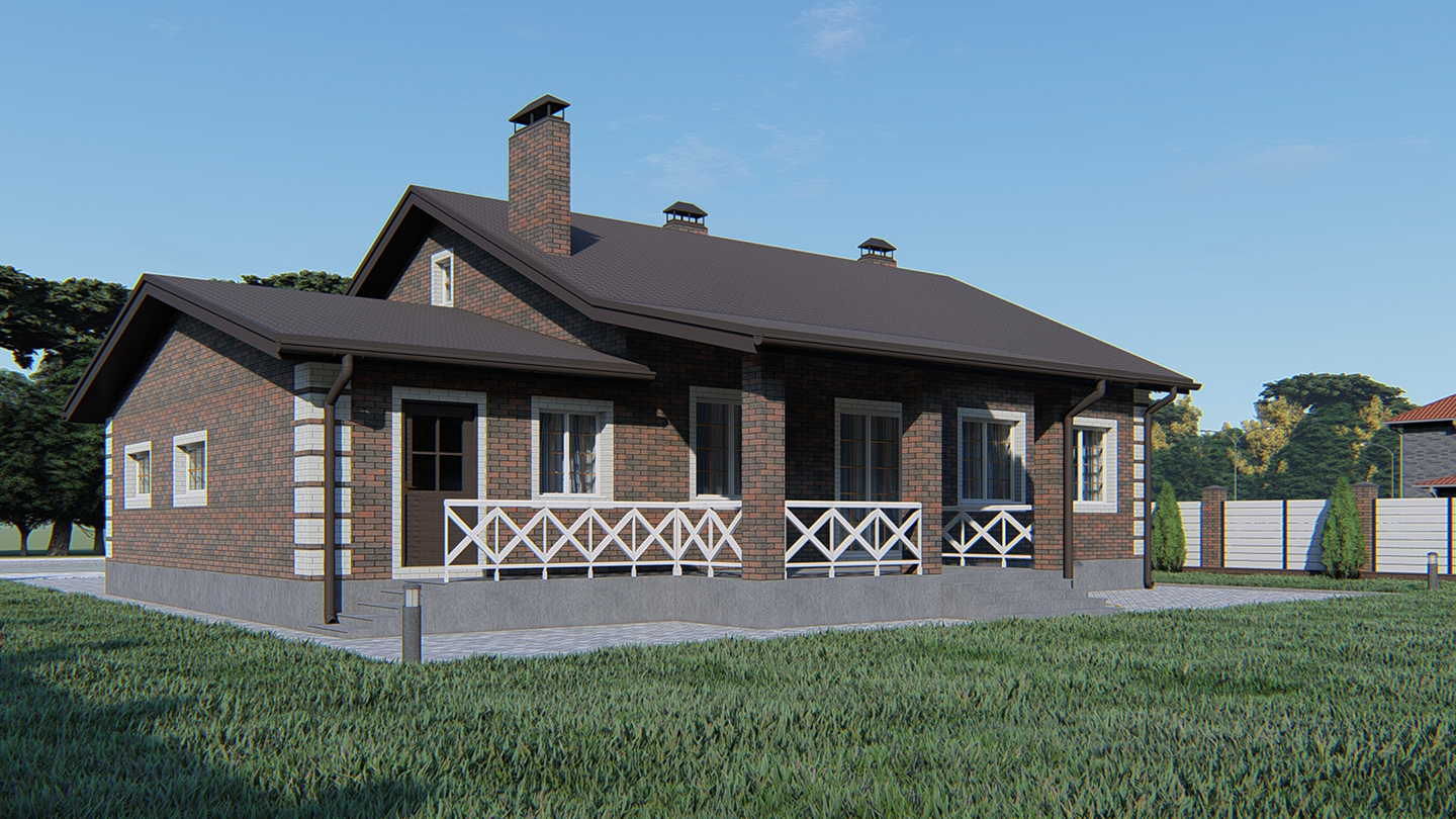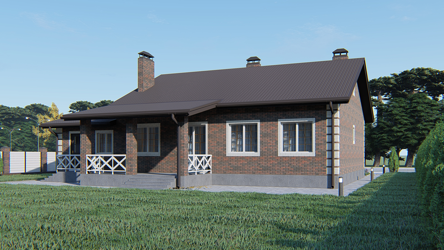 Просторный одноэтажный дом с тремя спальнями, большой кухней-гостиной и гаражом на автомобиль — это удобное решение для семьи, которая ценит комфорт, функциональность и уют.