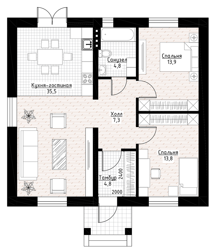 Тамбур — 4,8 м²: защищает от холода и грязи, сохраняя чистоту в доме.