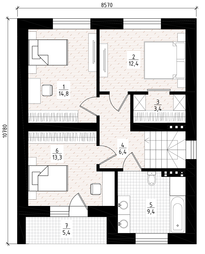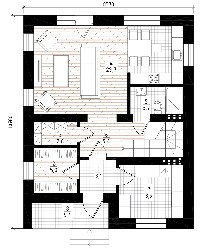 Проект рассчитан на семью из 3–5 человек, где ценят как простор для совместного времяпрепровождения, так и отдельные комнаты для личного пространства. Отличный вариант для постоянного проживания за городом.