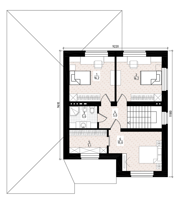 Холл — 5 м²: обеспечивает приватность спален и выход на лестницу.