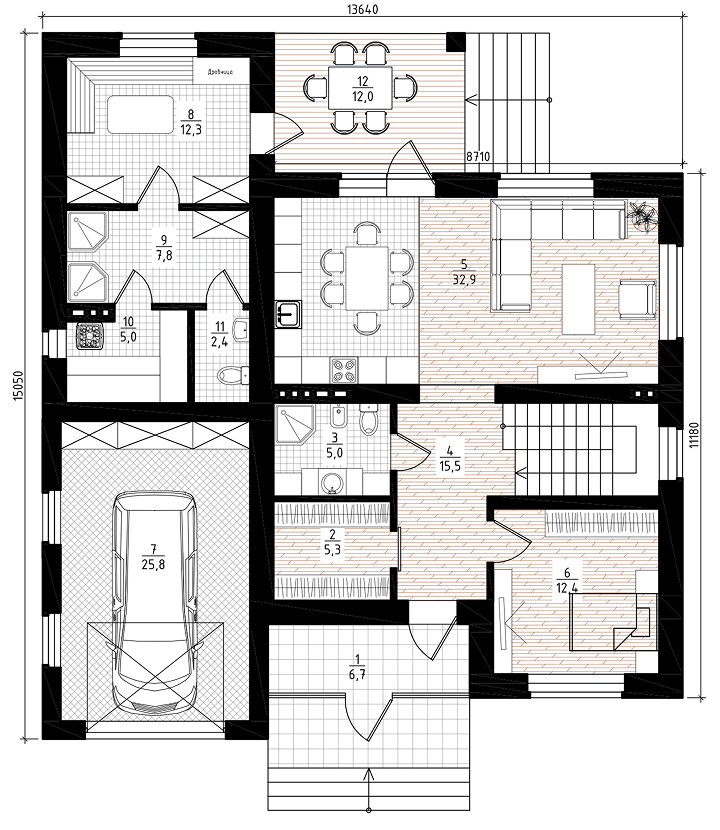 Тамбур — 6,7 м²: защищает дом от холода и грязи.