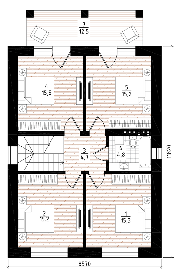 Этот проект сочетает просторные общие зоны и пять уютных спален, идеально подходя для большой семьи или тех, кто любит принимать гостей. Каждый этаж продуман так, чтобы в доме было комфортно и практично жить круглый год.