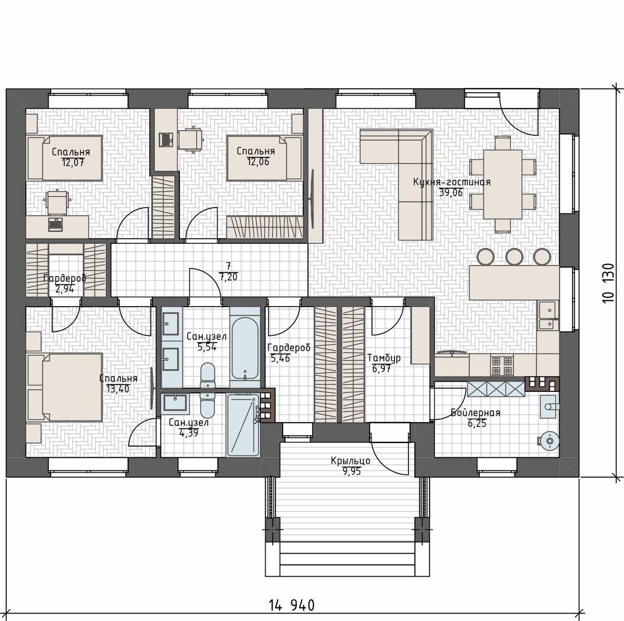 Этот одноэтажный дом площадью 121,3 м² сочетает функциональность и уют. Просторная кухня-гостиная и три спальни создают идеальное пространство для жизни семьи, а продуманная планировка обеспечивает комфорт в каждой зоне.