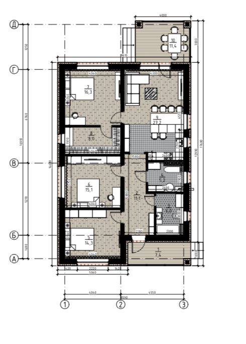 Этот современный одноэтажный дом создан для комфортной жизни семьи. Просторная кухня-гостиная, три спальни, две ванные комнаты, отдельная гардеробная и уютная терраса — всё продумано до мелочей для вашего удобства.