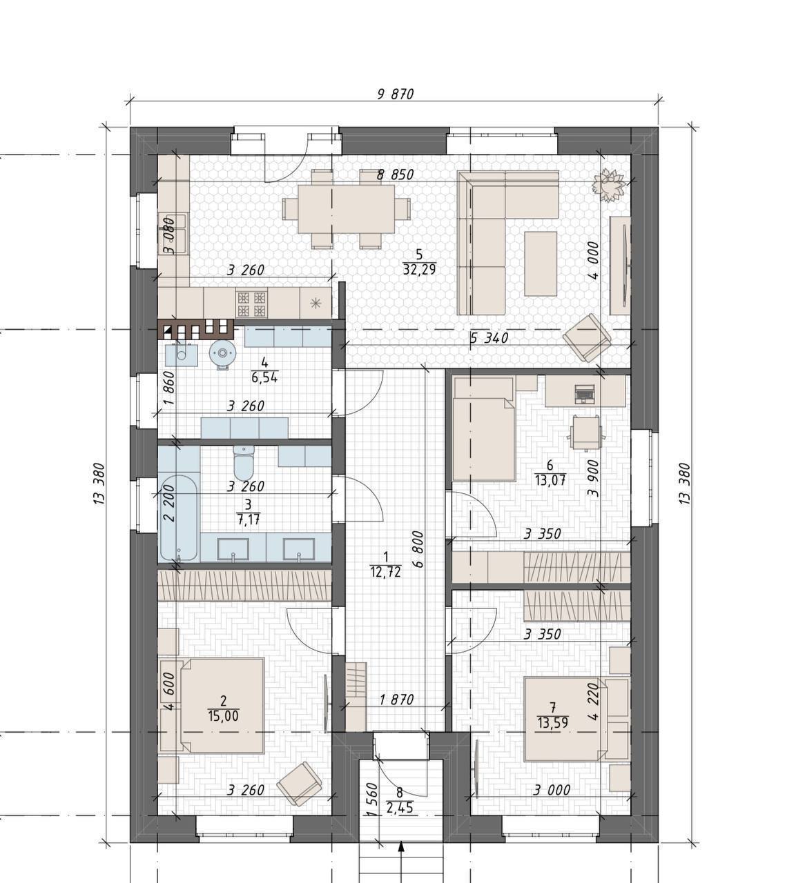 Кухня-гостиная (32,29 м²) – просторная зона для приготовления пищи, семейных ужинов и отдыха.